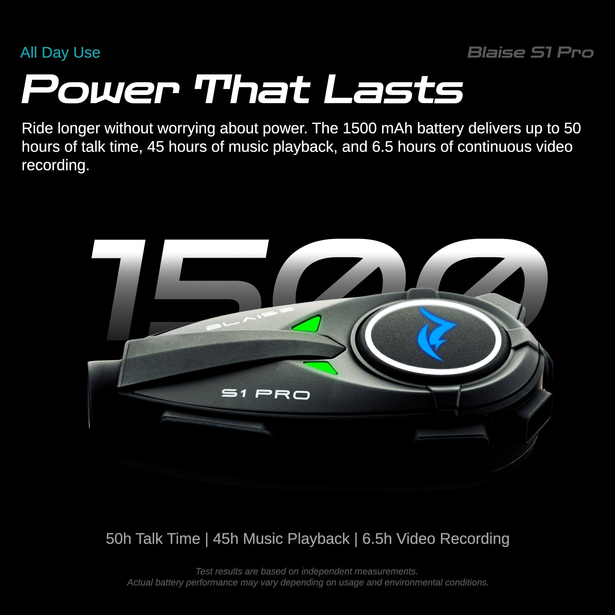 Ride longer without worrying about power. The 1500 mAh battery delivers up to 50 hours of talk time, 45 hours of music playback, and 6.5 hours of continuous video recording.