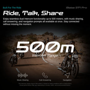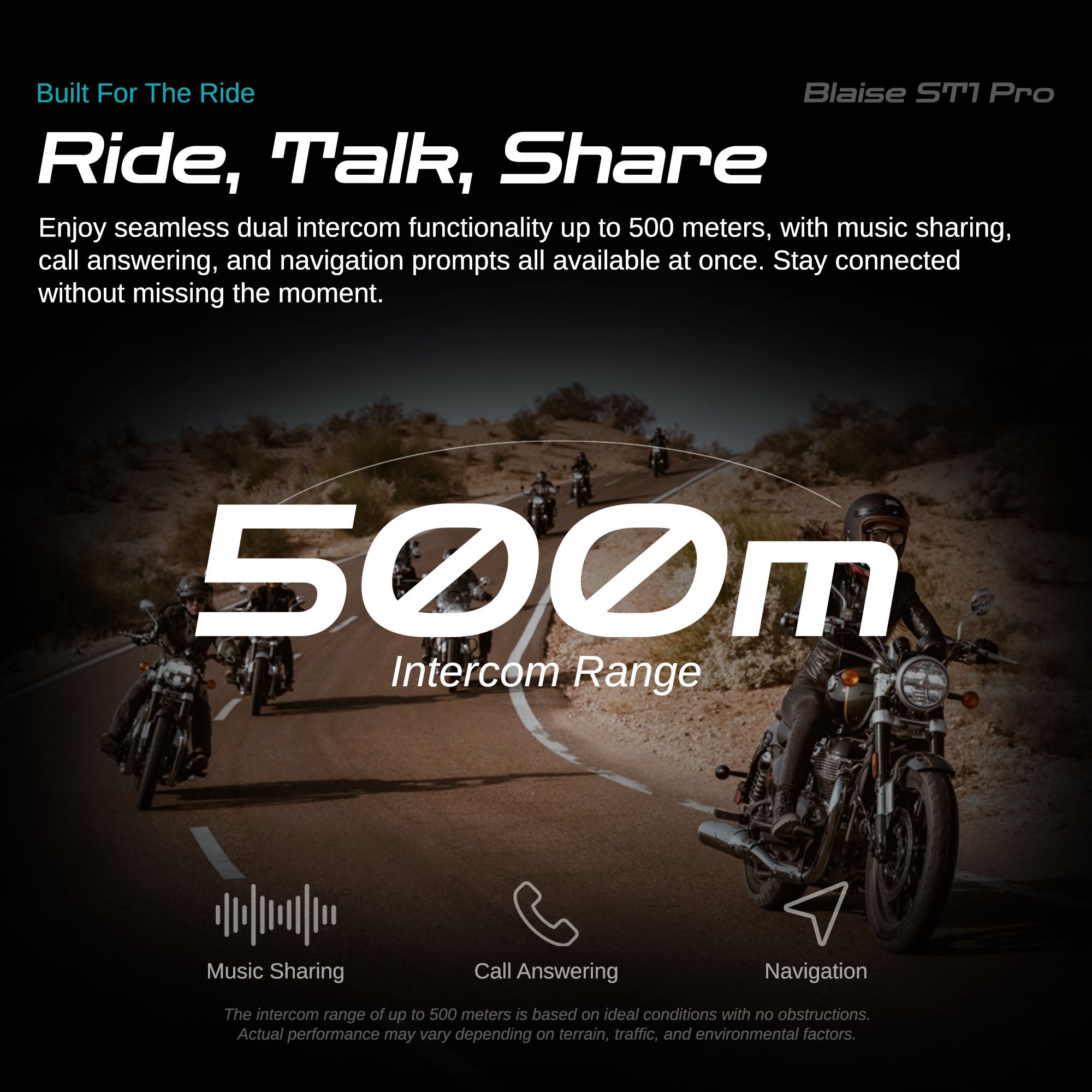 Enjoy seamless dual intercom functionality up to 500 meters, with music sharing, call answering, and navigation prompts all available at once. Stay connected without missing the moment.