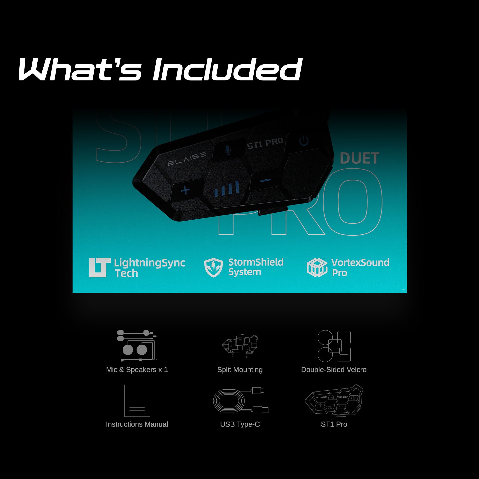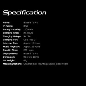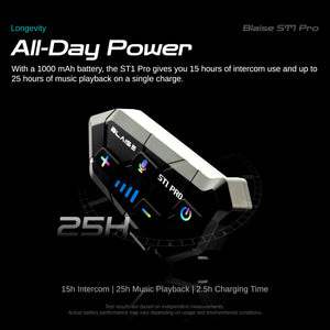 With a 1000 mAh battery, the ST1 Pro gives you 15 hours of intercom use and up to 25 hours of music playback on a single charge.