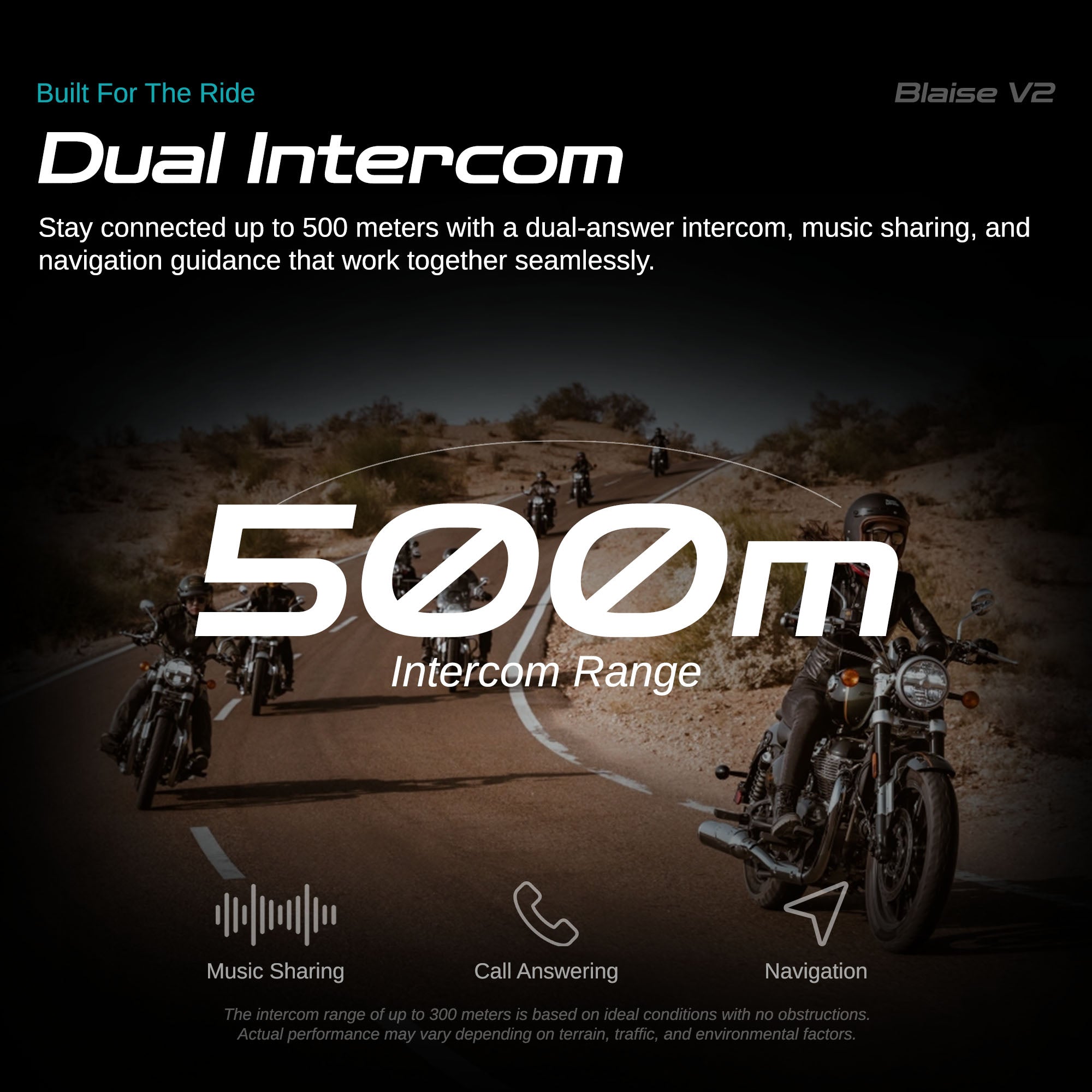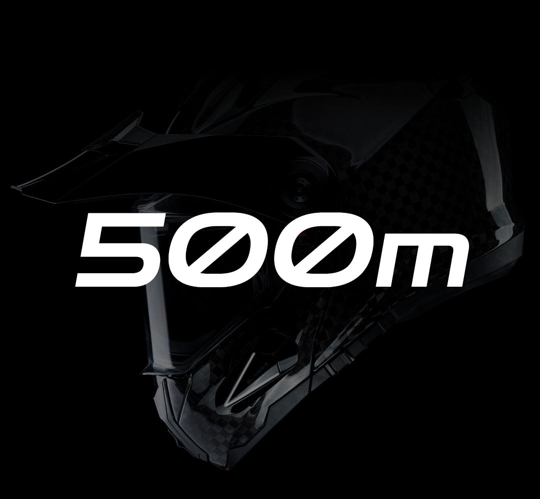The intercom range of up to 500 meters is based on ideal conditions with no obstructions. Actual performance may vary depending on terrain, traffic, and environmental factors.