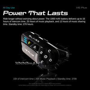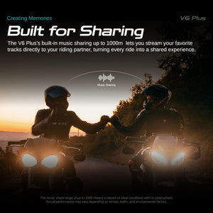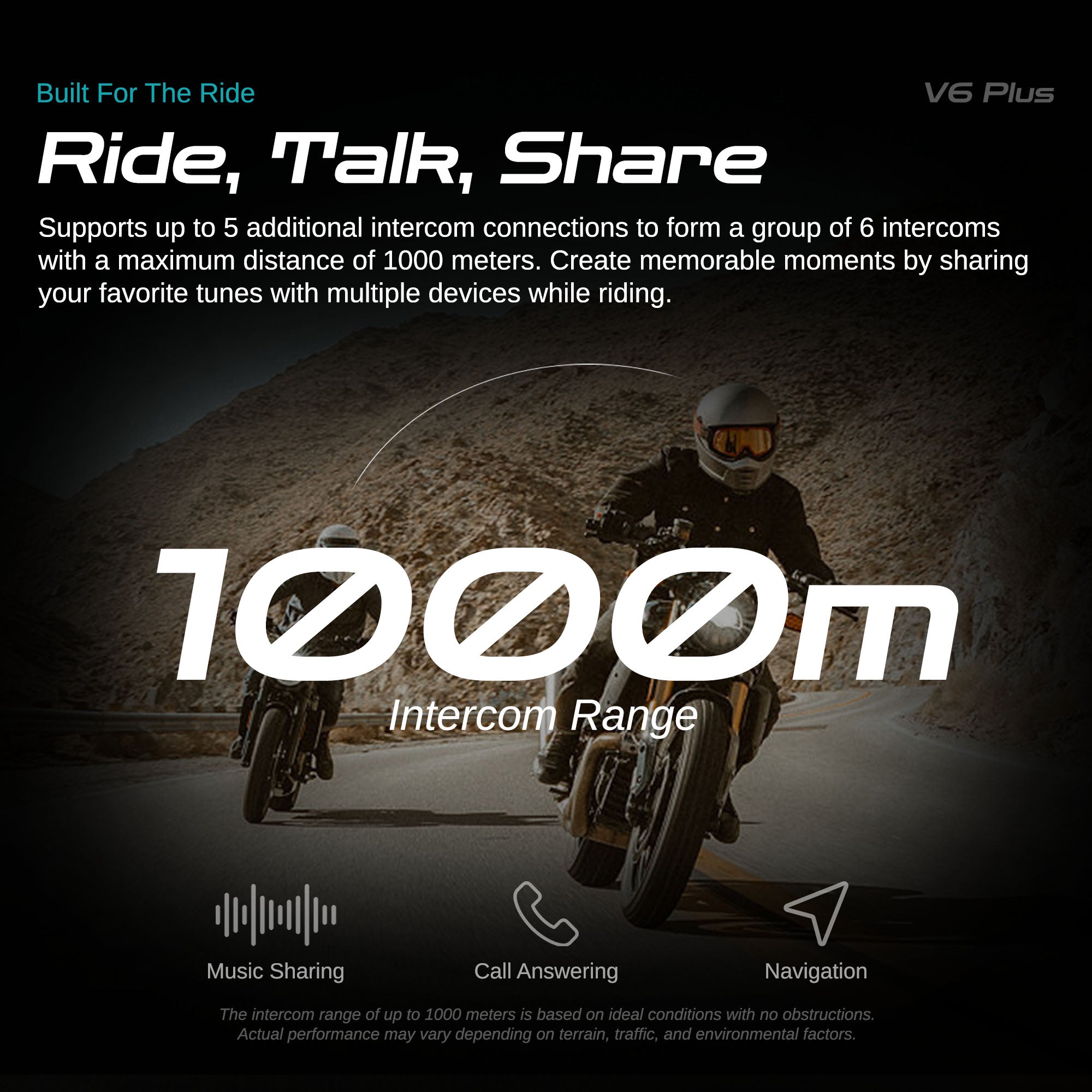 Supports up to 5 additional intercom connections to form a group of 6 intercoms with a maximum distance of 1000 meters. Create memorable moments by sharing your favorite tunes with multiple devices while riding.