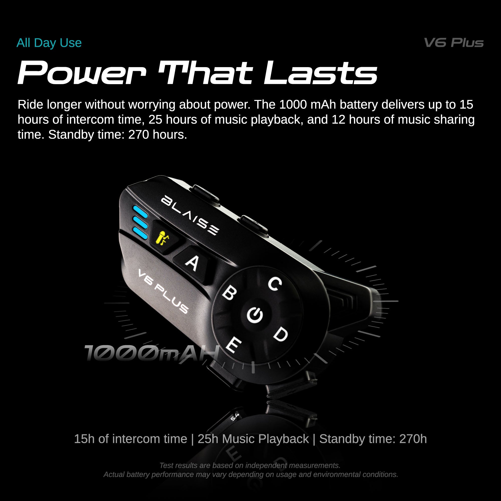 Ride longer without worrying about power. The 1000 mAh battery delivers up to 15 hours of intercom time,